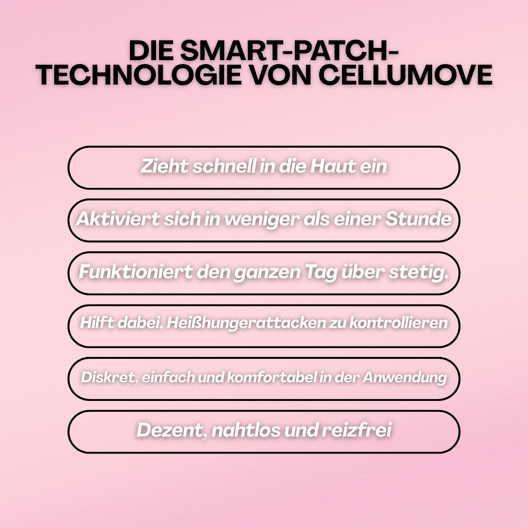 Das Cellumove-Pflaster ist mehr als nur ein einfaches Fettverbrennungspflaster. Es wirkt gezielt auf die neurohormonalen Signale, die den Appetit regulieren. Kein Koffein, keine Wundermittel – nur ein stabiler, natürlicher Ansatz basierend auf den neuesten Erkenntnissen der GLP-1-Forschung.